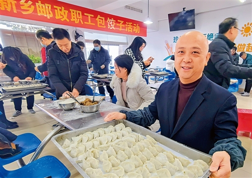 雪后初晴逢冬至,满屋充盈饺子香。12月22日冬至时节,在河南省新乡市邮政分公司员工食堂内,各部门员工欢聚一堂,一起动手包饺子。上午9点,员工们按时来到食堂,和面、擀皮、递托盘、发馅料、包饺子,大家分工明确,有说有笑,不到2小时,30大盘饺子包好。中午时分,大家围坐在一起品尝新鲜出锅的饺子,各网点、揽投部的一线员工也都吃到了企业送餐员送来的热气腾腾的饺子。□张堃樱 摄影报道